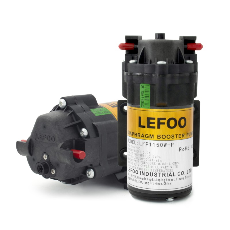 Pompa booster LEFOO 24V DC, debit 2 l/min, este o soluție compactă și eficientă pentru creșterea presiunii în sisteme de filtrare a apei potabile, osmoză inversă (RO), dozatoare, echipamente casnice și aplicații industriale de mică putere. Fabricată de LEFOO, brand recunoscut pentru fiabilitate, pompa oferă performanță stabilă, consum redus și durată mare de viață.