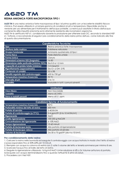 A620 TM este o rășină anionică macroporoasă furnizată sub formă de clorură, granule sferice, special concepute pentru înlăturarea nitraților din apa potabilă. Structura macroporoasă și propietatea de schimb de ioni o face ideală pentru eliminarea nitraților chiar și când sunt mari concentrații de sulfați. Astfel, nitrații sunt reținuți de mediul filtrant, iar apa purificată poate fi utilizată în mod sigur.
