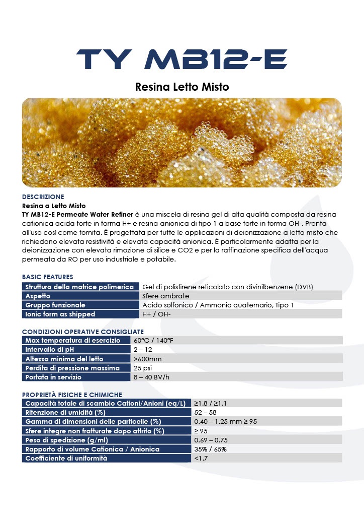 TY MB12-E Permeate Water Refiner este un amestec de rasini gel de inalta calitate, compus dintr-o rasina cationica puternic acida in forma H+ si o rasina anionica puternica de tip 1 in forma OH-.