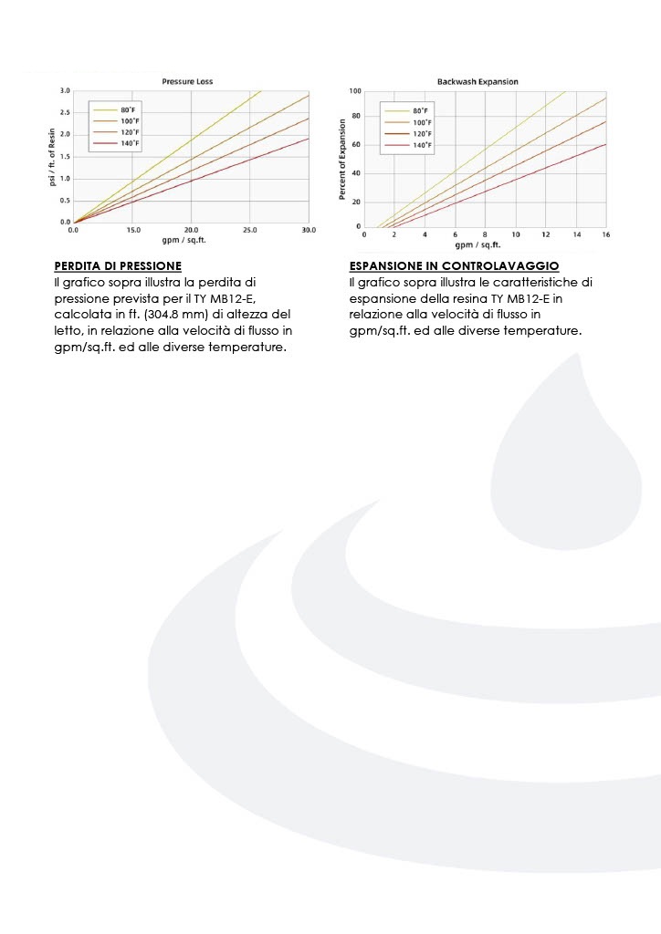 Graficul ilustreaza pierderea de presiune prevazuta pentru TY MB12-E, calculata pentru o inaltime a stratului de 304,8 mm, in functie de viteza de curgere (gpm/sq.ft.) si de diferite temperaturi.